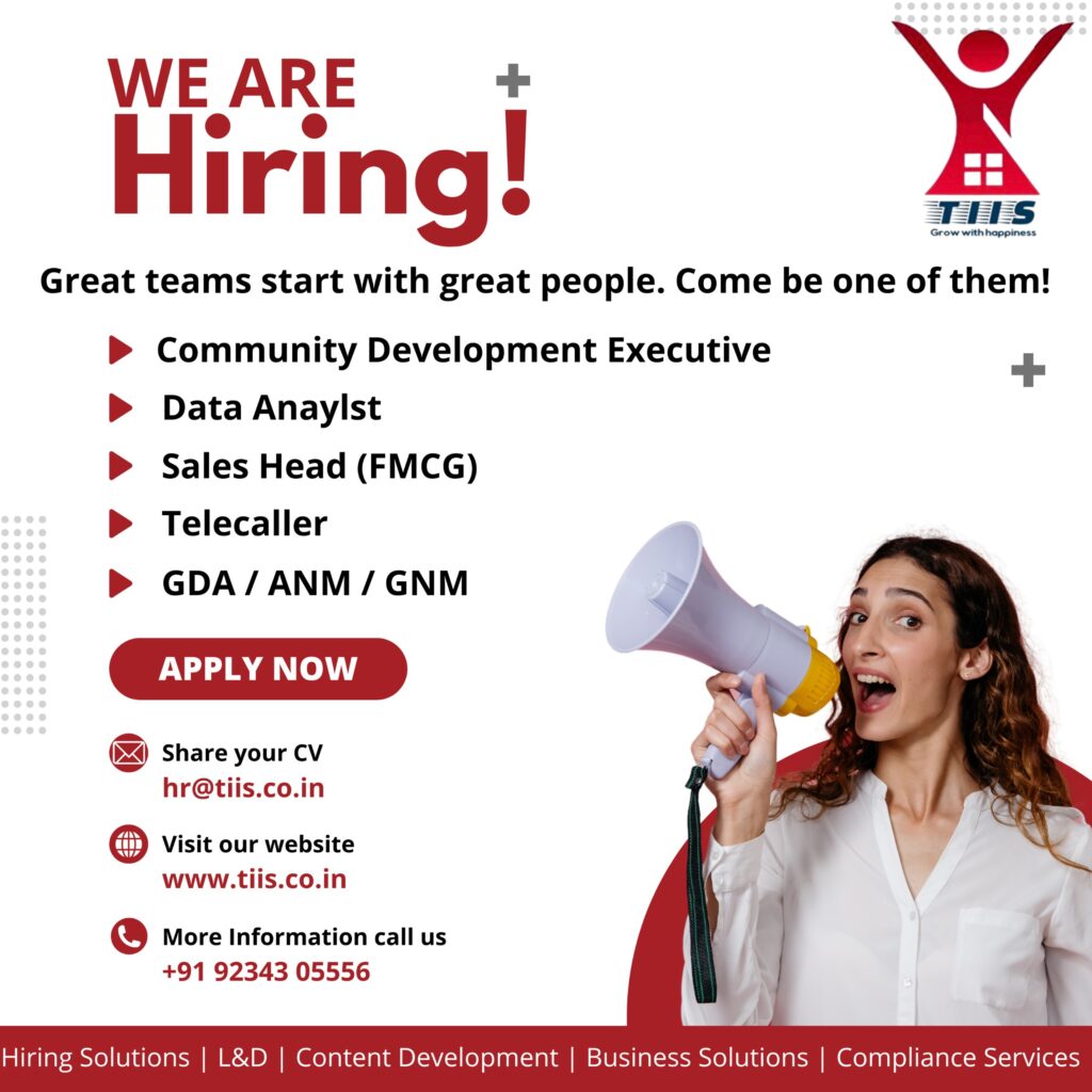 We are hiring for multiple positions, including Community Development Executive, Data Analyst, Sales Head (FMCG), Telecaller, GDA/ANM/GNM, Caregivers, Nurses, and Operations & Support roles. Interested candidates may apply by emailing their resume to hr@tiis.co.in, mentioning the position applied for, or simply filling out the below form and attaching an updated CV/resume and simply submitting it.